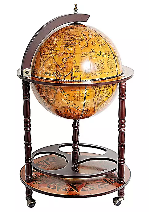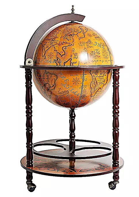 Featuring an old nautical map on its surface, the globe can be lifted to reveal the hidden drink cabinet and the highly decorated interior. Glassware and bottles can be placed at the bottom shelf as well as inside the globe. The cabinet is made of wood and painted in dark red mahogany. It comes with round carved wooden floor stands on the wheels. Globe measures 45cm diameter (17 3/4″). Overall dimension: 37 x 22 x 22. Some light assembly required. The cabinet is made of wood and painted in dark red mahogany. It comes with round carved wooden floor stands on the wheels. Overall dimension: 22″L x 22″W x 37″H Some light assembly required.