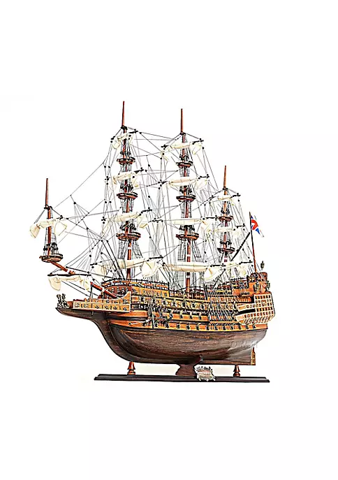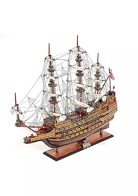This is museum-quality, FULLY ASSEMBLED replica of H.M.S. Sovereign of the Seas, a first-rate ship in the British Royal Navy for more than 50 years in the 1600s. This is an “Exclusive Edition” where the model has a unique serial number etched into the hull, which allows us to identify production date, material used and all other production information of a model. Master craftsmen using historical photographs, drawings or original plans meticulously handcraft these highly detailed wood models from scratch. They are built to scale with high-grade wood such as: western red cedar, rosewood, and mahogany. They are 100% hand built individually using plank-on-frame construction method and are similar to the building of actual ships. Each model requires hundreds of hours to finish and must go through a demanding quality control process before leaving the workshop. This magnificent Sovereign of the Seas model features plank on frame, three decks, and three rows of ferocious cannons on each side of the ship. A unique bowsprit design that consists of: brass statues and crafted brass ornaments on the panels. The front bowsprit and three large masts are connected securely using advanced rigging and lines painstakingly knotted and fastened by hand. Each yard has an attached hand-stitched rolled-up sails made of fine linen. Metal anchors and a wooden rudder are visible on the front and rear of the ship. On the deck, there are metal stationed cannons, authentic hand-built lifeboats with ribs and planks, wooden cabin, and many other handcrafted ornaments. There is also an exquisite detailed admiral’s quarter on the stern with a beautiful handcrafted metal lantern, amazing metal crafted statues, and many other spectacular brass ornaments. This model comes standard with a solid wood base and brass nameplate. It’ll make a perfect gift for home or office decorator, boat enthusiast or passionate collector. The front bowsprit and three large masts are connected securely using advanced rigging and lines painstakingly knotted and fastened by hand. A unique bowsprit design that consists of: brass statues and crafted brass ornaments on the panels. This model comes standard with a solid wood base and brass nameplate. Dimension: 35″L x 12″W x 37″H