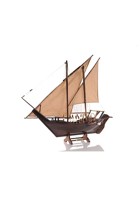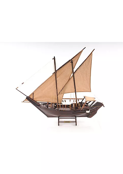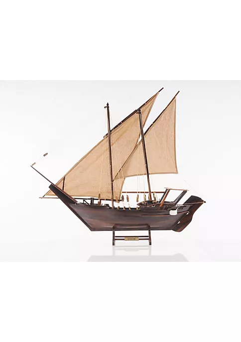 For many centuries, boats that sailed on the Indian Ocean were called dhows and were distinguishable from ships that sailed on the Mediterranean or China Sea by the shape of the Dhow’s triangular sails. Today you can own this unique model fully assembled in your own home or office! The Dhow is made out of stained wood with no metal or plastic pieces. It features plank on frame construction. The front bowsprit and two triangular masts are connected securely using advanced rigging and lines painstakingly knotted and fastened by hand. Each yard has an attached hand-stitched unfurled sails made of fine linen. Metal anchors and a wooden rudder are visible on the front and rear of the ship. It comes with a stand and ready for display. The Dhow is made out of stained wood with no metal or plastic pieces. It features plank on frame construction. Product Dimensions: 30.5″L x 5.0″W x 26.5″H.